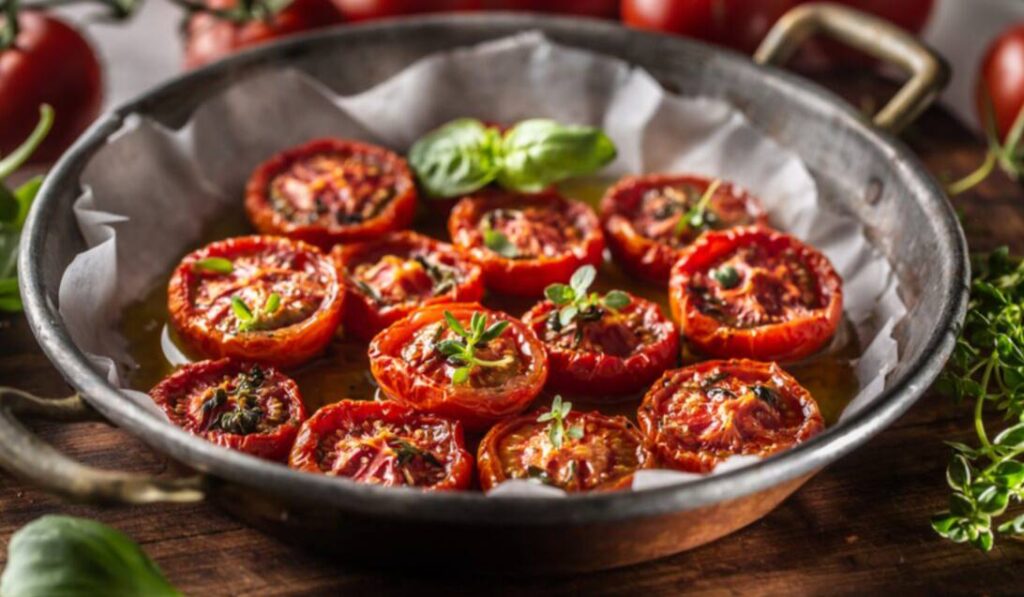 3. Разрежьте помидоры пополам. Смешайте с маслом, чесноком, луком, итальянскими травами и сахаром.
