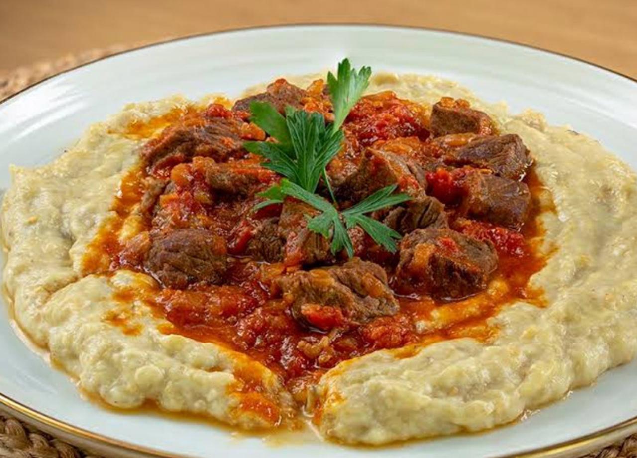 Мелко нарезанный лук обжарить на сковороде, мясо нарезанное небольшими кусочками добавить к луку помешивая тушить 10 мин. Затем добавить очищенный от кожицы и нарезанный помидор и тушить до тех пор пока не испарится вода. Посолить,  поперчить залить 2 стаканами теплой воды и варить до готовности примерно 1.5 часа. Пюре из баклажан.