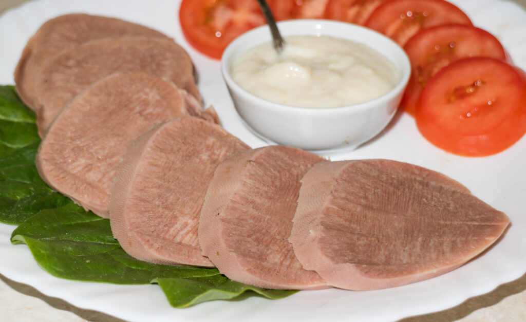 Язык почистить, хорошо вымыть. Заложить в кипящую воду, пену снять. Через час добавить соль, лавровый лист, морковь и головки лука. Варить до готовности. Говяжий язык варится от 2 до 4 часов. Готовность языка проверяем вилкой, она должна легко входить. Готовый язык вынимаем, опускаем на несколько минут в холодную воду и сразу же снимаем кожу, поскольку с холодным языком сделать это затруднительно. Охлажденный язык нарезаем ломтиками, выкладываем на блюдо, украшаем вареным яйцом, огурцом, помидором, зеленью кинзы и лука. Заливаем крепким бульоном. Делаем соус из сметаны, аджики, смеси сухих пряных трав, чеснока, соли. Подаем язык с соусом.