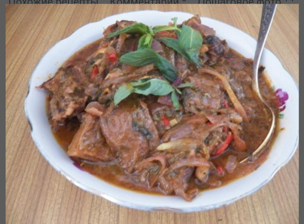 Репчатый лук нарежьте полукольцами, потушите в соусе десять минут. Перец чили, веточки кинзы и укропа измельчите, добавьте к луку и перемешайте. Полученную массу перелейте в кастрюлю с говядиной и варите под крышкой. Продолжайте тушить еще 5 минут.