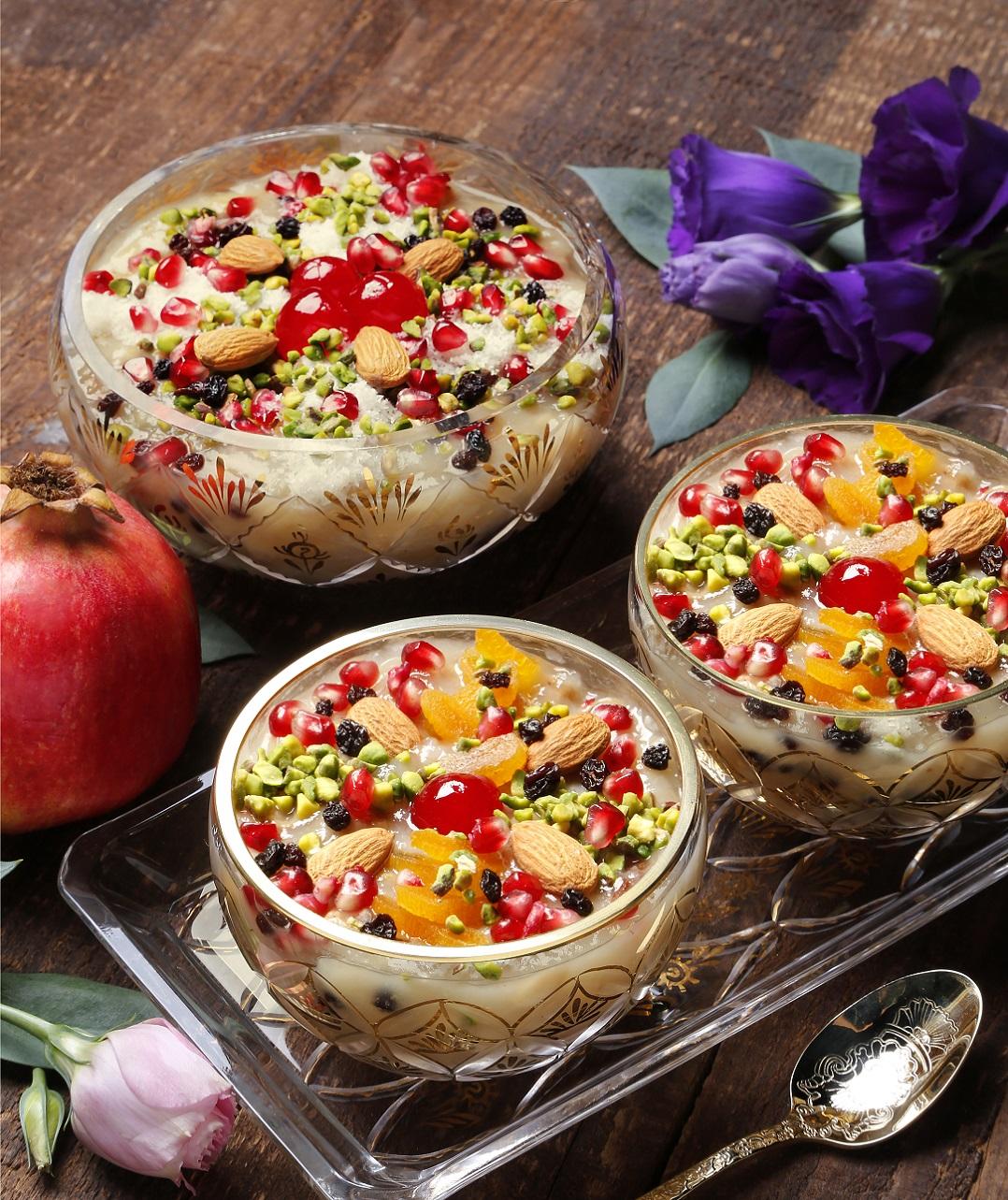 Пшеницу, фасоль , бобы , нут с вечера замочить, слейте воду. Рис с половиной водш варить 30 м. Пшеницу отварите в оставшейся воде. Добавьте рис с водой и варите 2-3 ч. Фасоль , бобы и нут варите по отдельности. Нут очистить от кожицы. К пшенице добавить сахара , крахмал развести в 1 стакане воды, и варить на медленном огне до загустения. Положить отварные фасоль, бобы, нут, изюм, разрезанные на 4-5 ч.сушеный абрикосы , инжир и молоко. Варить 10-.15 м. Выложить в пиалы. После того как остынет посыпать орешками, кедровыми орехами, кишнишем и гранатами.
