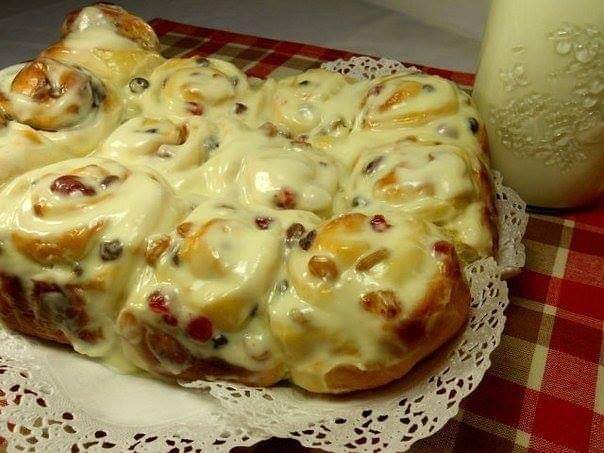9. Горячими булочки покрываем сливочной заливкой — взбиваем сливочный сыр, сливки или сметану и сахарную пудру.