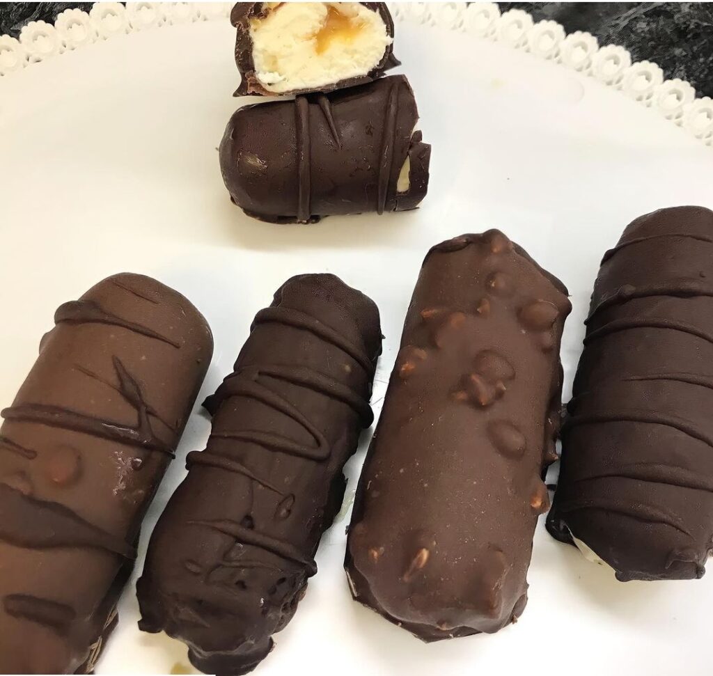 Затем творог перекладываем в кондитерский мешок и выдавливаем на пищевую пленку. Сверху карамель и снова творог, заворачиваем все в рулетики и отправляем в морозилку часа на 2.