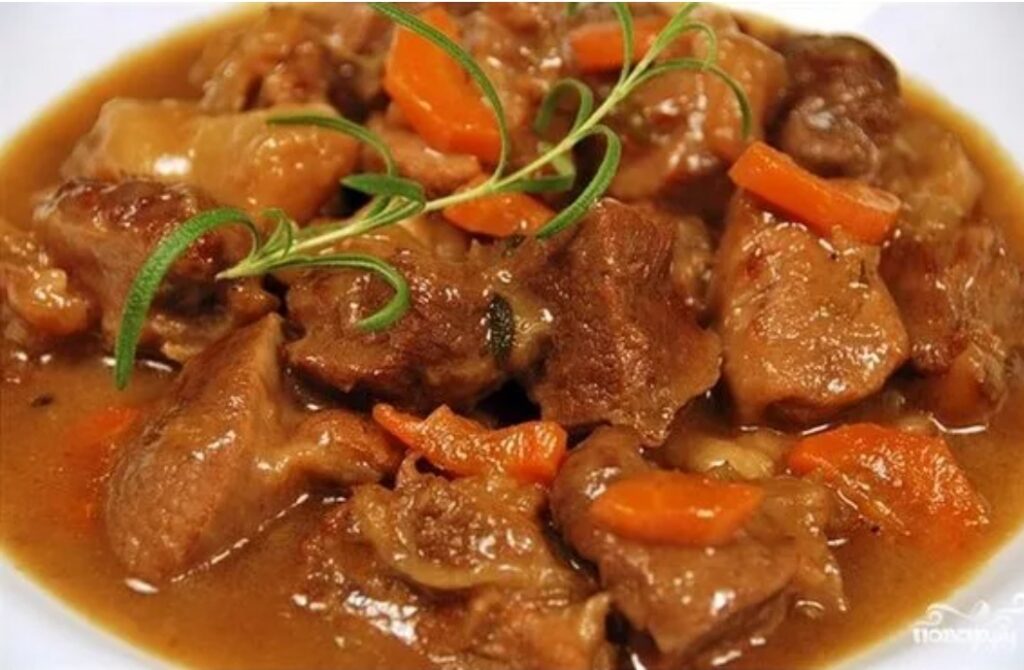 1.Кусок мяса обработать, отбить, положить на сковороду с растительным и сливочным маслом и обжаривать до образования золотистой корочки с обеих сторон , добавить соль .Налить вино и мясной бульон.