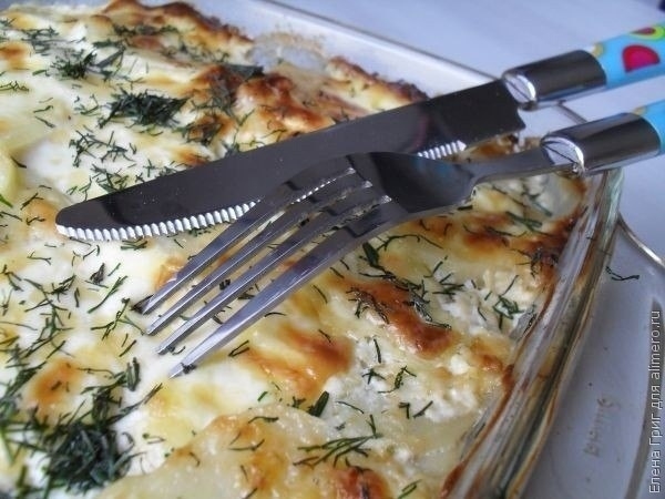 Почищенную картошку нарежьте как можно тоньше, это нужно, чтобы она не осталась сырой при запекании.