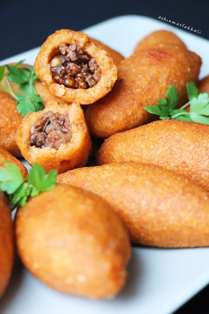 Маргарин растопить в кастрюле, прожарить вместе с мелко нарезанным луком и кедровыми орешками. Добавить мясо и потушить до испарениьт жидкости . Снять с огня . Добавить соль, черный перец, тимьян , грецкие орехи , изюм и мелко нашинкованную петрушку и тщательно перемешать. В отдельной посуде перемешать оставшееся мясо с булгуром .Добавить соль , черный и красный перец и яйцо. Тщательно перемесить , время от времени сбрызгивать водой. От мяса с булгуром отрывать кусочки с размером грецкий орех , скатать в ладонях шарики, указательным пальцем проделать в них отверстие и расширить как можно больше . Затем заполнить это отверстие фаршем, надавливая закрыть концы. Намочить ладони и в ладонях придать им форму полумесяца. Готовые котлеты отварить в соленой кипящей воде 5 мин. Достать шумовкой, перед подачей на стол поджарить на сковороде.