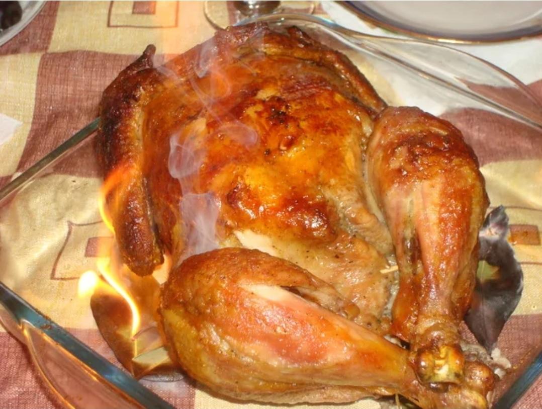 4.Сухие лавровые листья выложить на огнеупорное блюдо, положить на них курицу слегка сбрызнуть спиртом и поджечь.