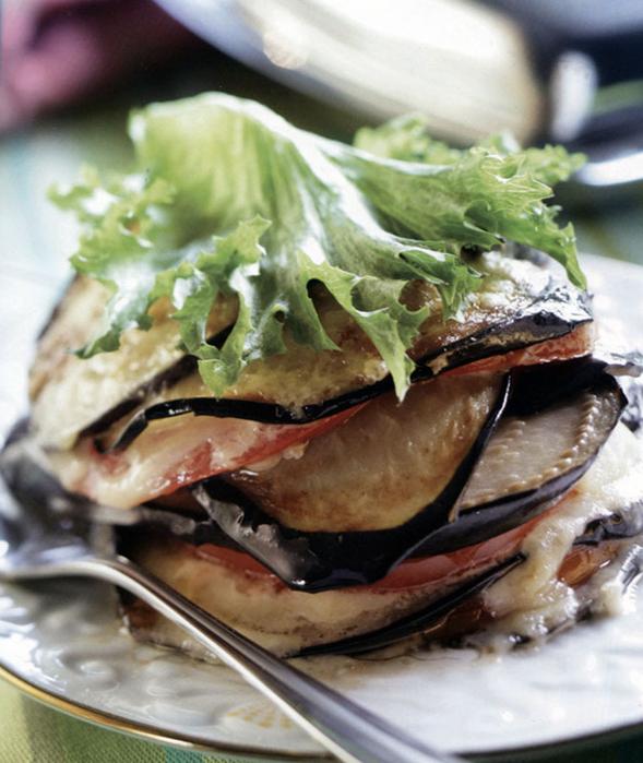 Баклажаны нарезать вдоль пластинками толщиной 0.5 см. и положить в соленую воду на 30 минут.Баклажаны обсушить и обжарить с двух сторон. Сыр нарезать кусочками, помидоры -кольцами.Выложить на противень слоями:баклажаны -помидоры+сыр-баклажаны -помидоры +сыр-баклажаны .Скрепить шпажками и запекать в духовке 10 мин.