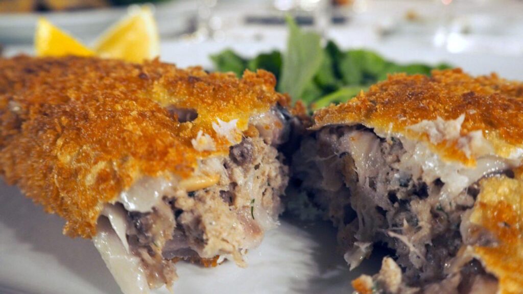 Рыбу очистить и тщательно помыть. Затем снять кожицу, отрезать голову и отделить мясо от костей. Филе мелко покрошить. На сковороде с раскаленным маслом поджарить нарезанный лук до румяного цвета. Добавить крупно молотые орехи, кишмиш, специи и нарезанную рыбу. Тщательно перемешайте и тушите 5 мин. Затем добавьте петрушку и еще раз перемешайте. От массы берите по небольшому кусочку, придайте форму голубца, обваляйте в муке, окуните во взбитые яйца , затем обваляйте в панировочных сухарях и пожарьте по 3-4 шт.на сковороде с раскаленным маслом. Подавать на стол в холодном виде.