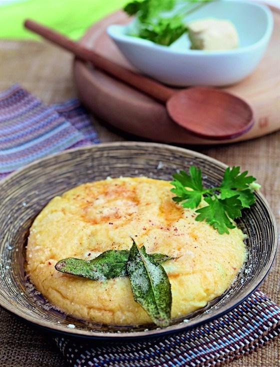 В воду влить молоко , посолить, добавить муку, довести до кипения. После того как закипит, добавить хлеб и варить на небольшом огне 10-15 минут, непрерывно помешивая.Сыр нарезать небольшими кусочками и добавлять в молоко с хлебом, помешивая , чтобы сыр расплавился. Зубчик чеснока обжарить на сливочном масле и вместе с маслом добавить в поленту. Украсить готовое блюдо зеленью петрушки.