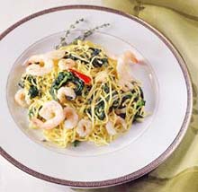 3.Размороженные в теплой воде креветки смешать с тальолини, полить оливковым маслом и украсить зеленью.