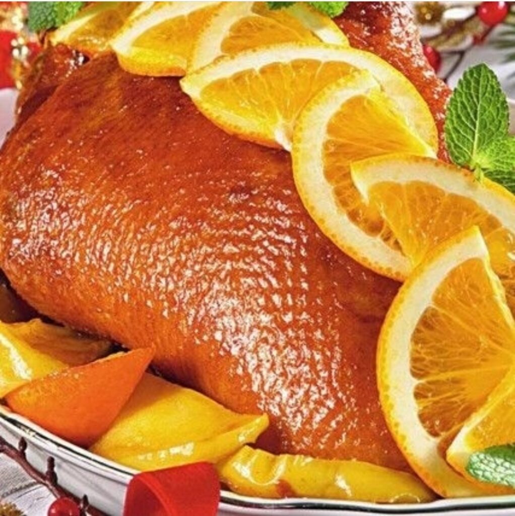 9️⃣ Готовую утку достать из духовки, находившиеся внутри сельдерей и апельсин выбросить, полить утку сверху приготовленной горячей глазурью. Можно украсить 🍊🍊🍊.