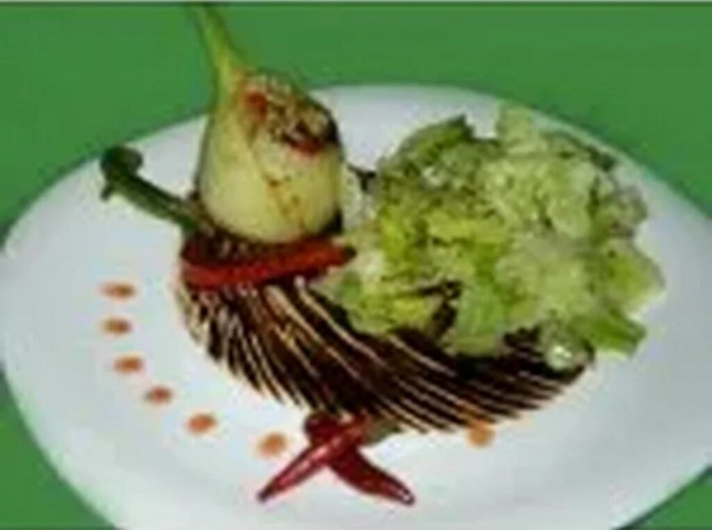 3.Половинки фенхеля наполнить фаршем и тушить на сковороде 10 мин.Перед этим обжарить на сковороде измельченный чеснок.На стол блюдо подавать теплым.