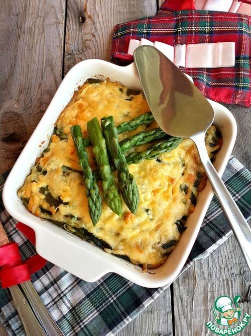 4.Глубоку сковороду смазать маслом, выложить на дно слой спаржи, залить половиной яичной смеси, положить 4 перепелиных яица, затем слои повторить.