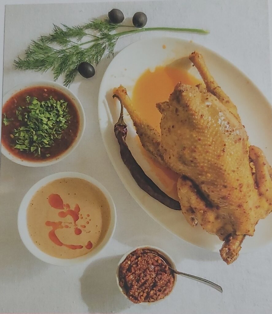 Bütün tavuğu tuzsuz kaynatın, soğanı pişirme sırasında ekleyin. Pişmiş tavuğu et suyundan çıkarın, hafifçe soğutun. Acıka’yı 2-3 çay kaşığı et suyu ile seyreltin, tuz ekleyin, karıştırın. Tavuğu elde edilen yulaf ezmesi ile kaplayın.