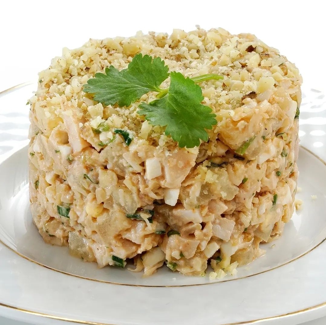 Fındıkları lezzetlendirmek için kuru bir tavada hafifçe kızartın ve soğutun . Haşlanmış yumurtaları 3-5 mm kenarlı küpler halinde kesin. Tavuk filetoyu aynı küpler halinde kesin, aynı büyüklükte küpler halinde kesilmiş konserve ananastan sıvıyı boşaltın. Kişniş ve yeşil soğanı ince ince doğrayın. Peyniri ince rendeleyin. Sosu hazırlayın: mayonez ve ketçapı karıştırın Sarımsağı bir presle sosun içine sıkın (sarımsak miktarını beğeninize göre ayarlayın). Sosa doğranmış kişniş ekleyin. Tavuk fileto, yumurta, ananas, yeşil soğan ve fındıkları bir salata kasesine koyun (dekorasyon için birkaç fındık bırakın) Salataya rendelenmiş peynir ekleyin.Ortaya çıkan sos ile salatayı süsleyin.Tadına bakın ve zevkinize göre tuz ekleyin. Üzerine ceviz serpip servis yapın.