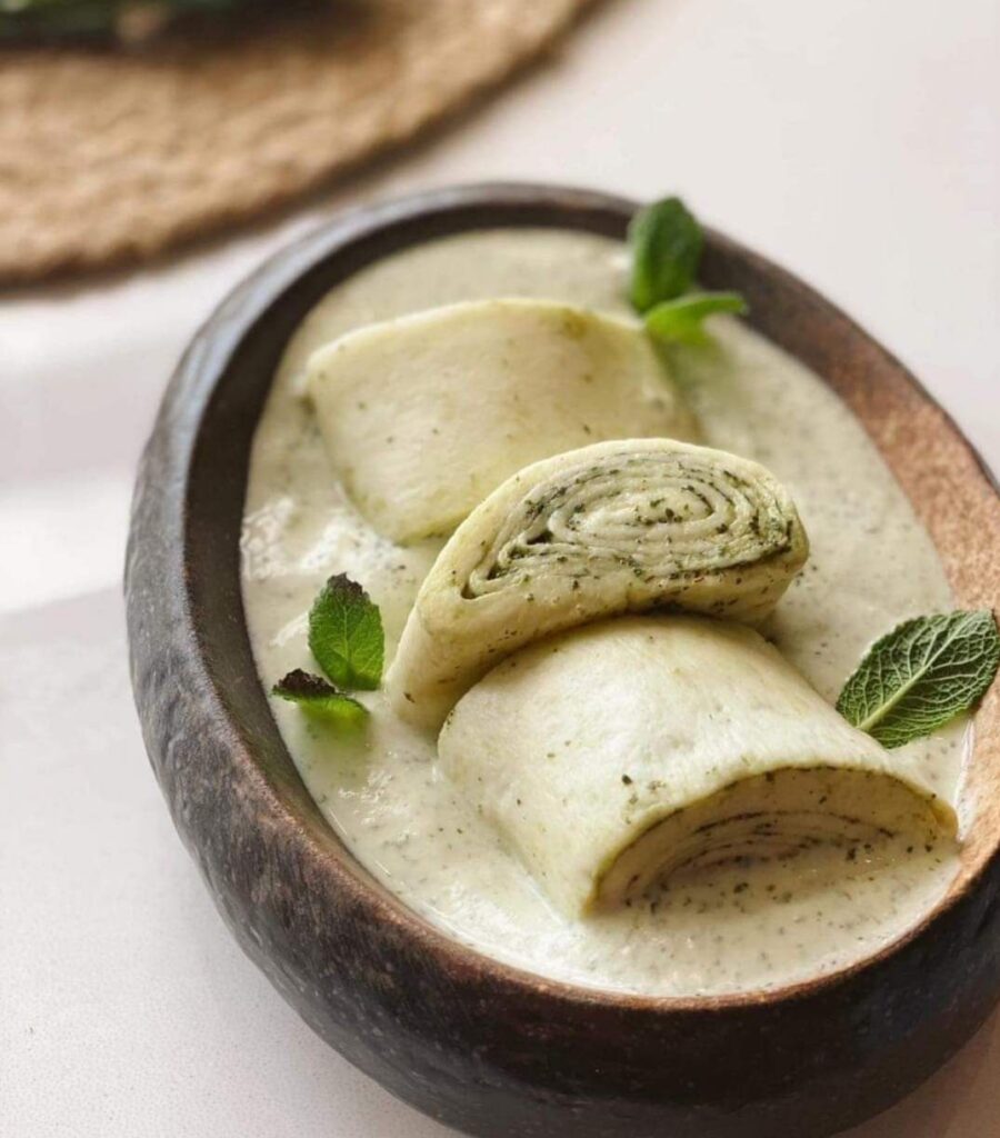 ✅ Parçaları servis için bir kaseye koyun, yoğurt dökün ve 1 yemek kaşığı nane acıka ekleyin, taze nane yaprağıyla süsleyin.