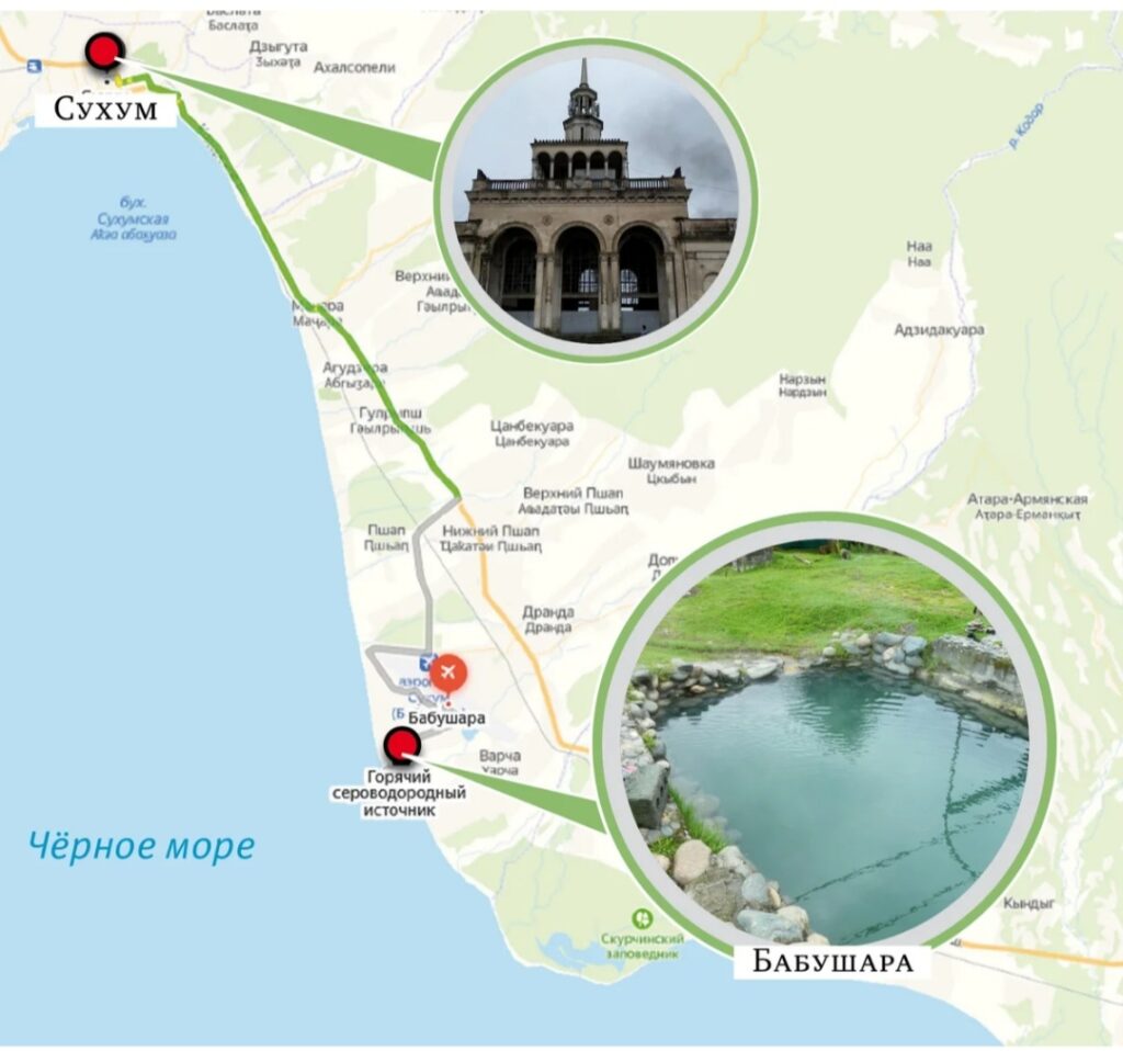 Termal kaplıca” nerede aranır? Gulripş bölgesi, Babuşara köyü. Sohum’a 25 km, arabayla 30 dakika, nokta Yandex haritalarında. Mekan yılın herhangi bir zamanında etkileyici olacak, ancak Aralık-Şubat aylarında kesinlikle bir sıçrama yapacak! Termal banyolarda 15 dakikadan fazla kalamayacağınızı unutmayın. Tüm kontrendikasyonlar girişteki stantlarda belirtilmiştir.