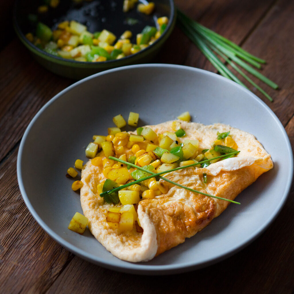3. Omleti dört parçaya bölün ve her birini ters çevirin, kapağı kapalı olarak birkaç dakika daha pişirin. Sıcak servis edilir.