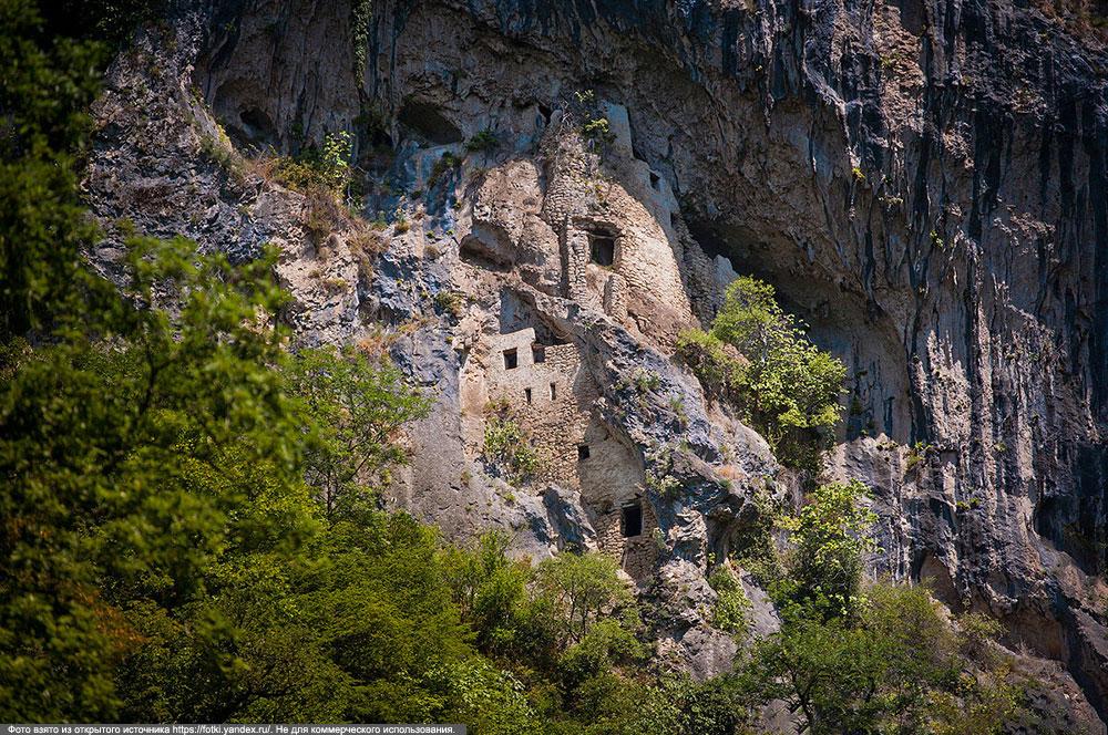 Mçişta’nın kayanın altından çıktığı yerin üzerinde, yaklaşık 50 metre yükseklikte yedi katlı bir kaya manastırı asılıdır.